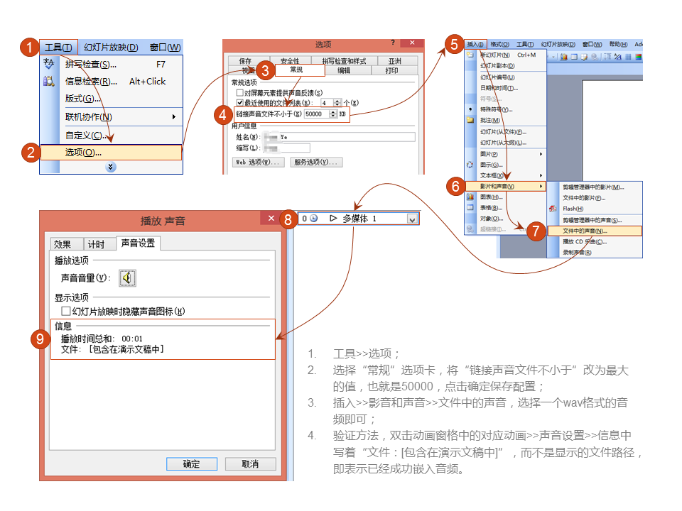 - 同时最大只能插入50000KB的音频文件,但是恰恰不爽的是,wav格式可能会比较大,这样子就不能嵌入了;